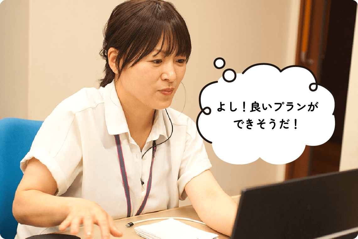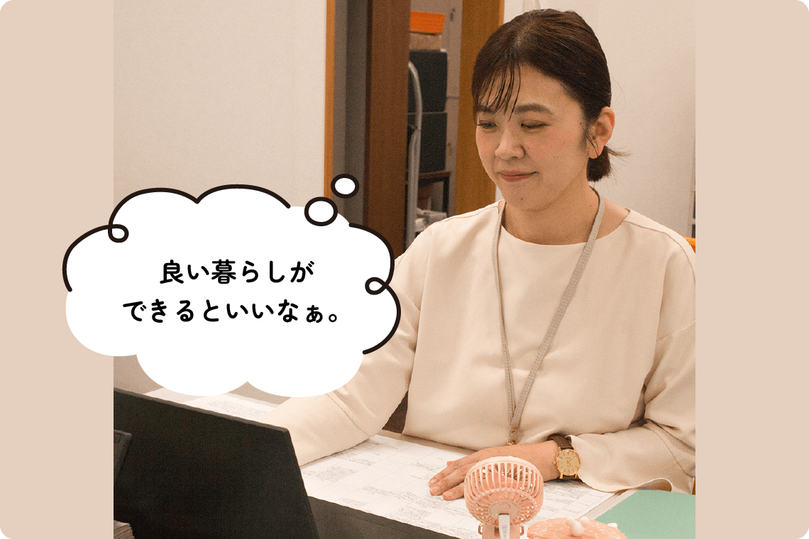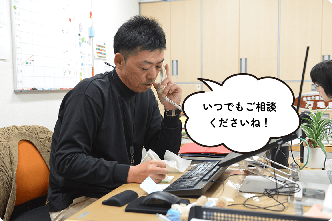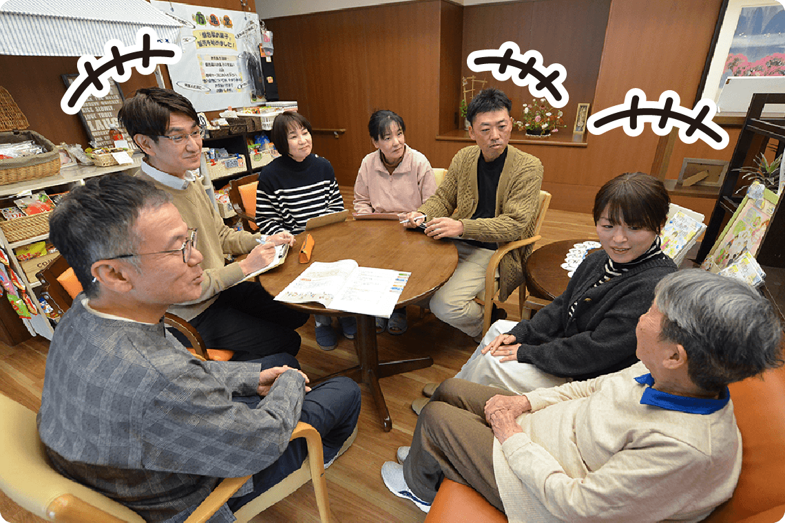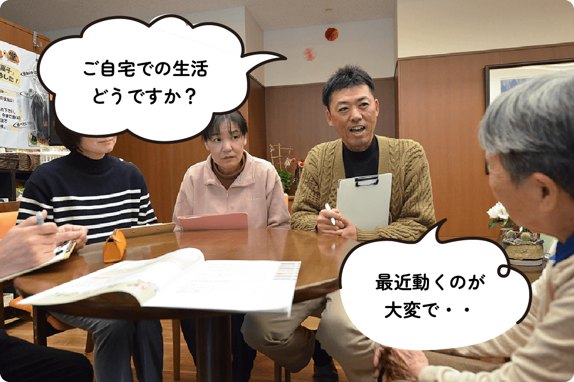 居宅では、自宅を訪問して生活状況や希望を聞き取り、本人に合った介護サービスのケアプランを作成。定期的な訪問で生活の変化を確認し、介護事業所や地域の関係者と連携しながらサポートします。