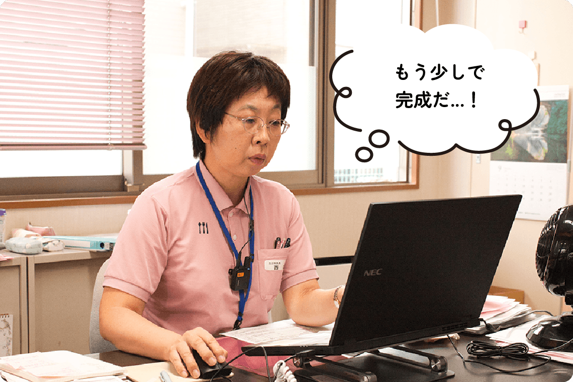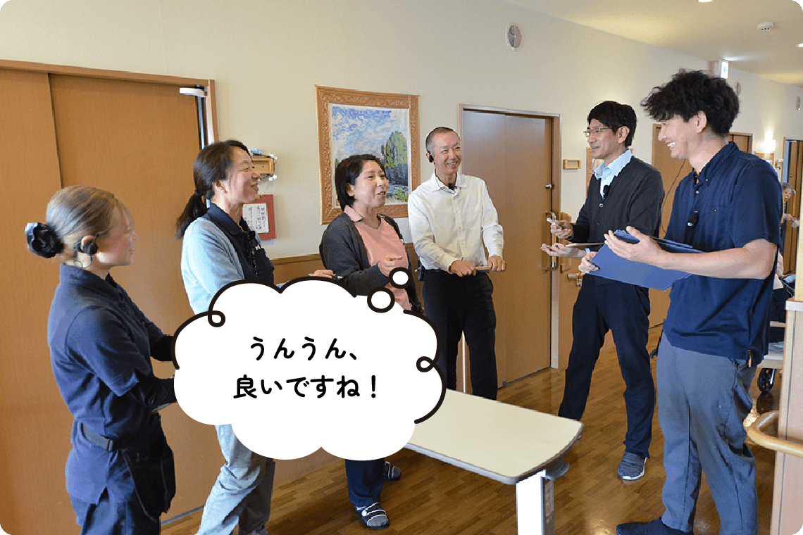 特養では、入居者様の体調や生活状況を観察し、本人やご家族の思いを反映したケアプランを作成。医師や看護師、リハビリスタッフなど多職種と連携し、日々の変化に応じて見直しを行います。