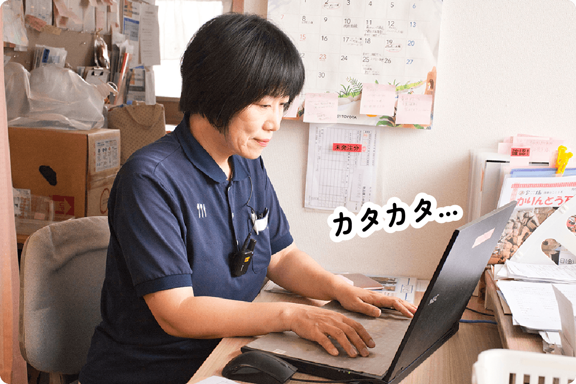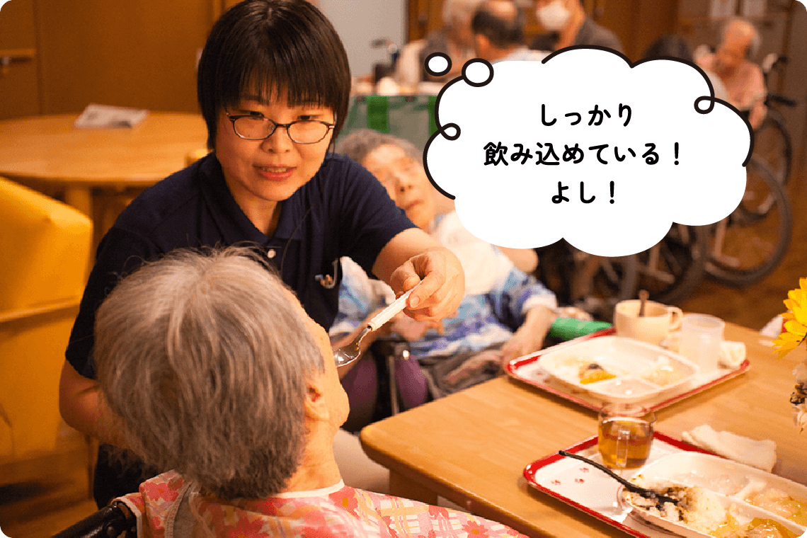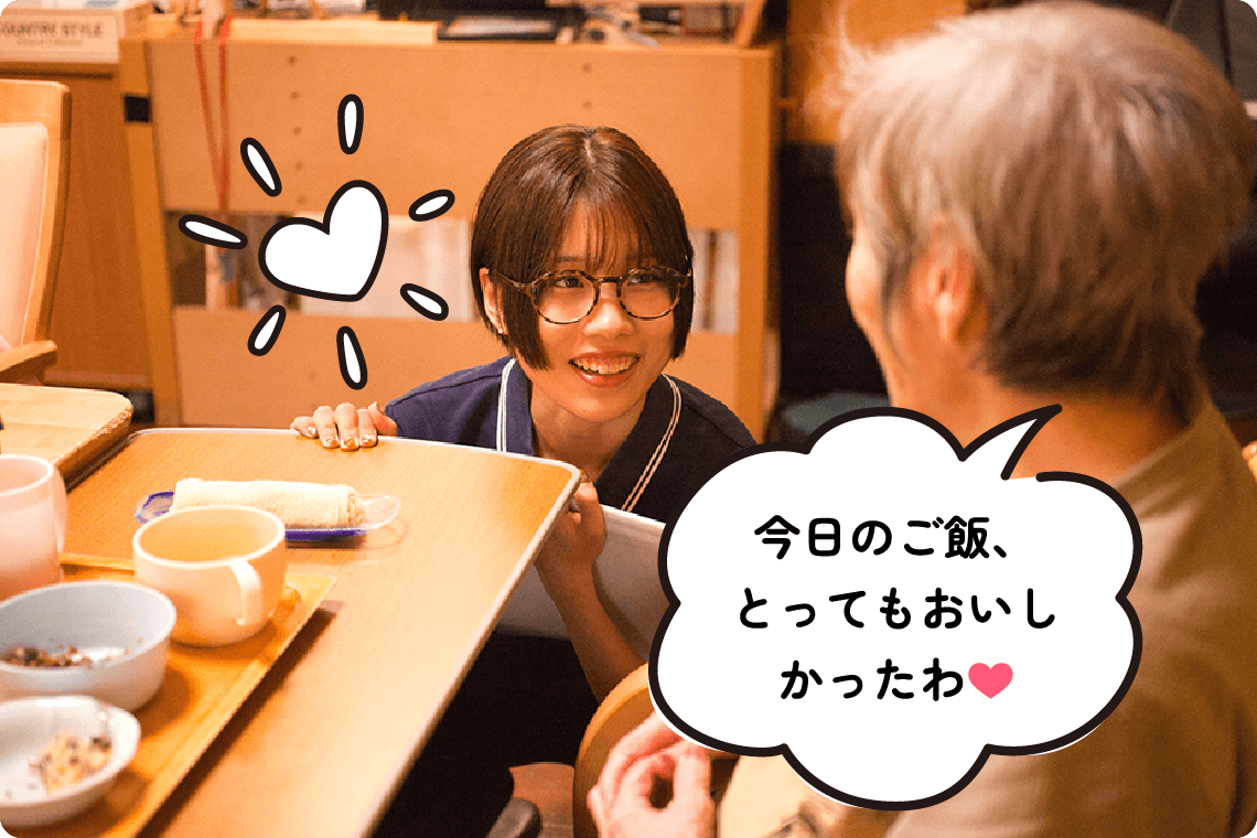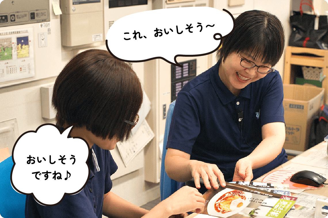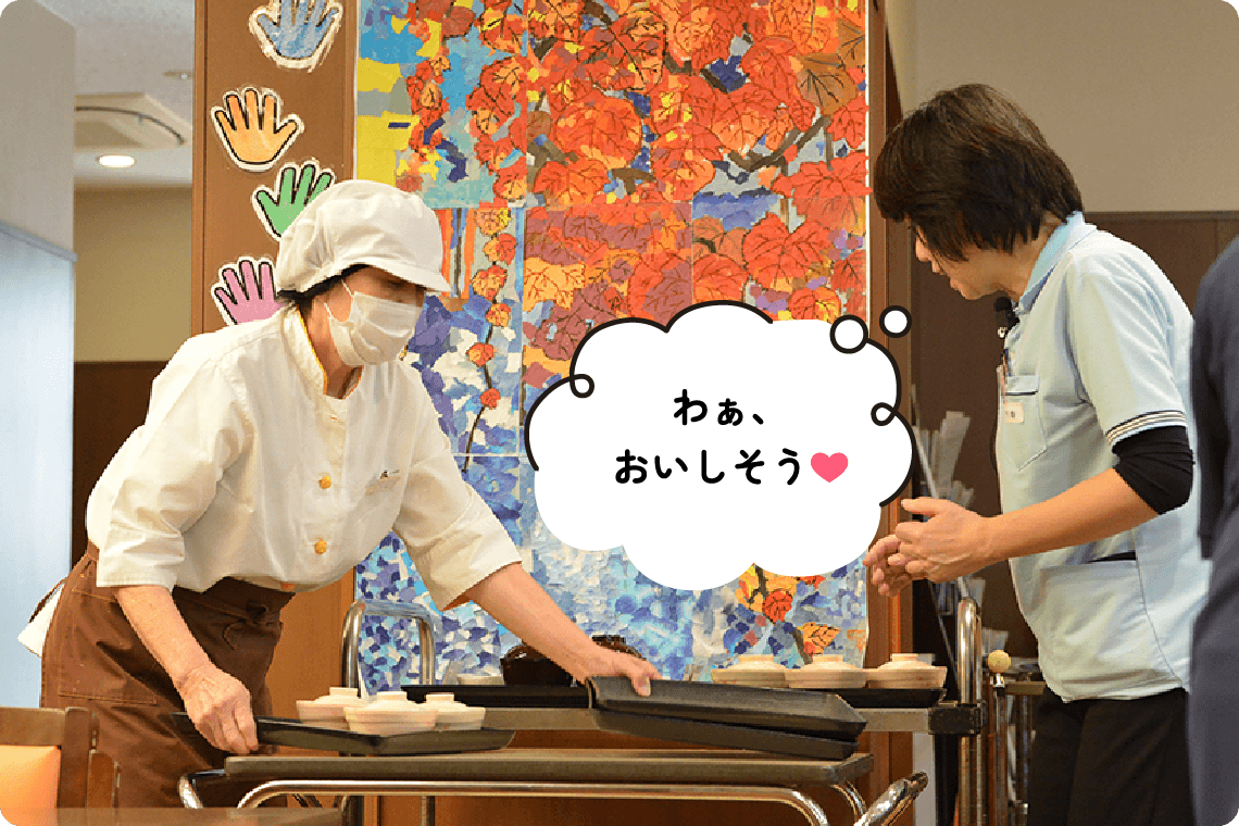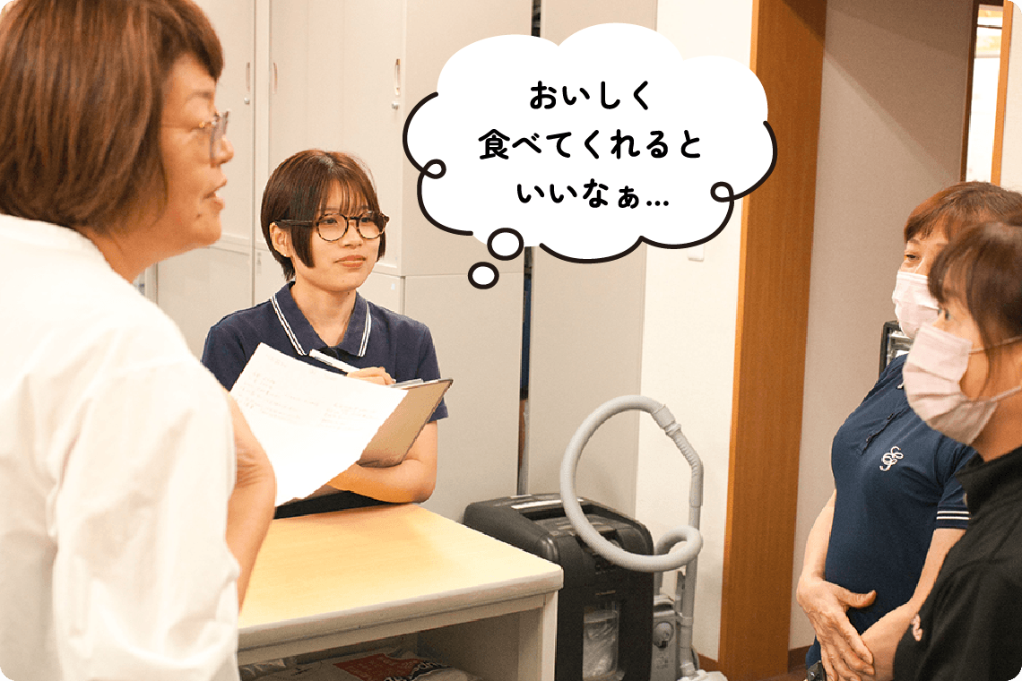 万亀会では、入所者様や通所者様に安全で楽しい食事を提供するため、食札作成や食数確認、朝食やユニット用の飲食物・胃ろう食の発注などを行っています。毎月のごちそうメニューやイベント食などの献立作成や、食事が取りにくい方への形態変更・補助食品の提供など食事状況の確認も担当。さらに、年3~4回の料理クラブや会議参加、移動スーパー対応などを通じて、利用者様の食生活を豊かにするサポートをしています。