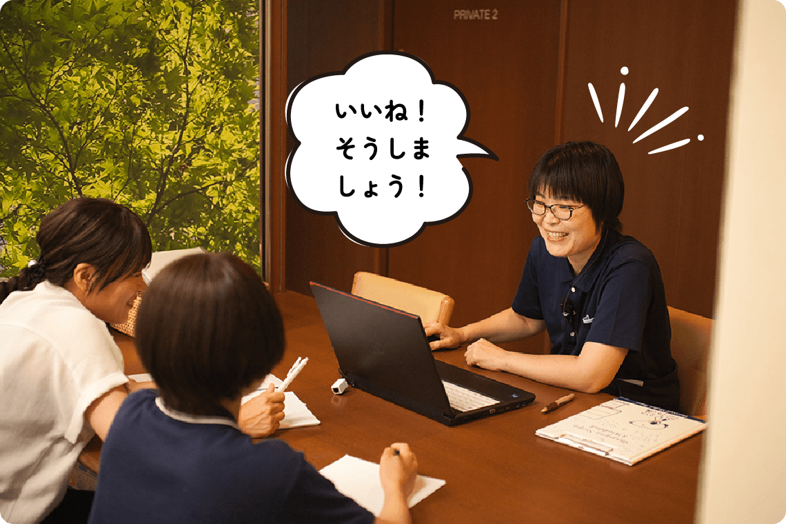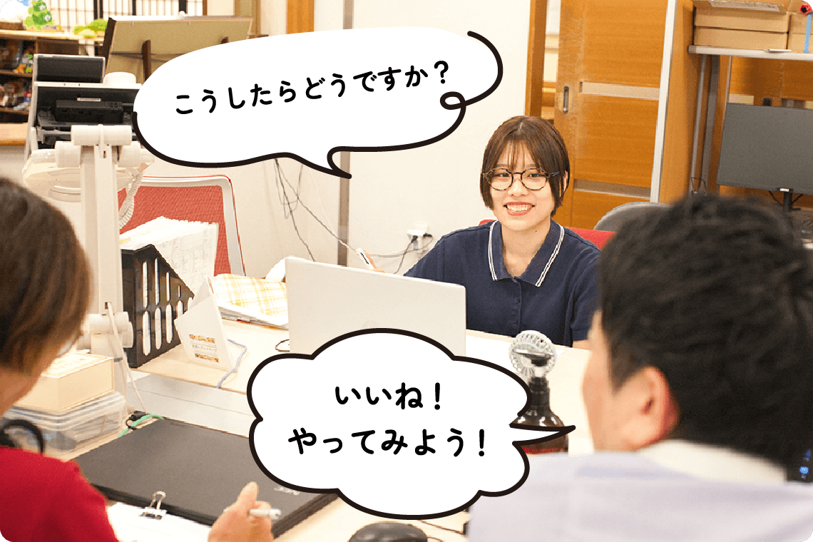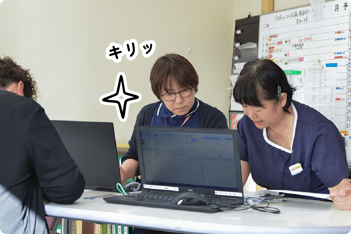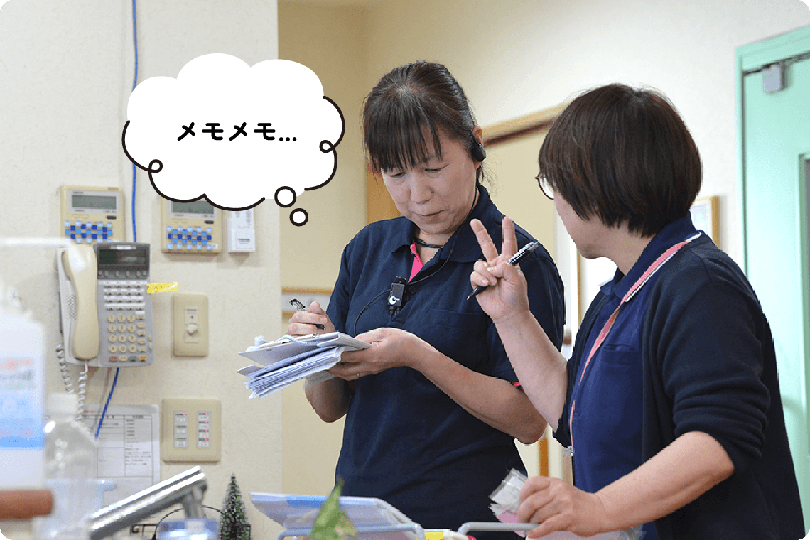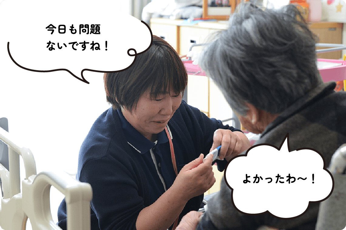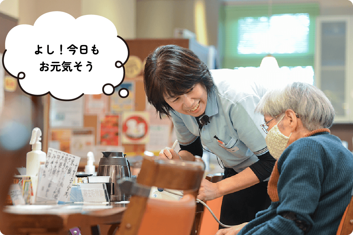 万亀会では、看護師は特養とデイサービスの両方で活躍しています。特養では、入居者様が病気と上手に付き合いながら、自分らしく安心して暮らせるよう支援します。デイサービスでは、利用者様の体調管理や服薬確認、リハビリ時の見守りなどを通じて、在宅生活を支えます。ご本人やご家族、多職種との連携を大切にし、看護師が安心してケアできる環境づくりにも努めています。