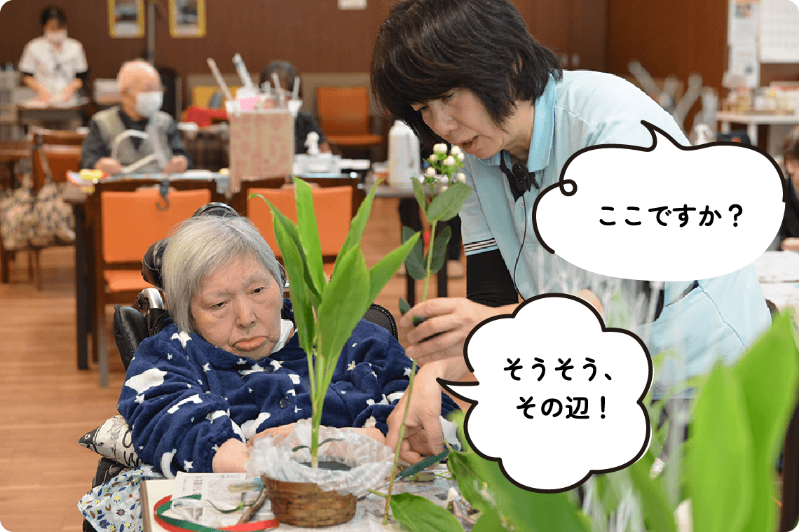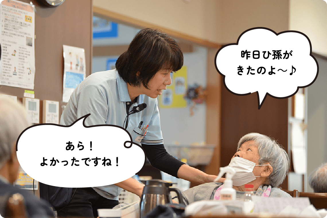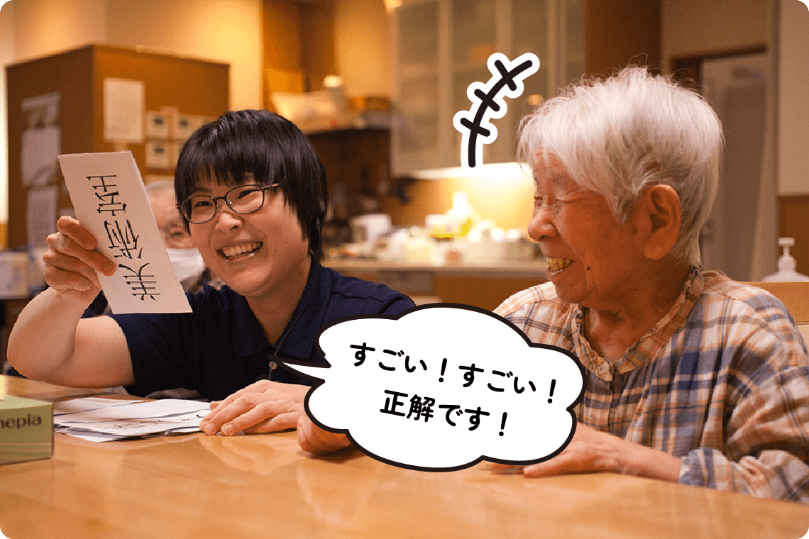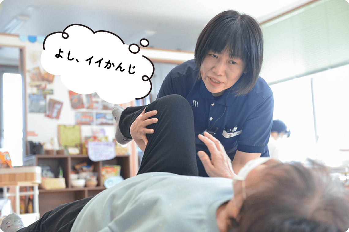 万亀会では、特養、デイサービスでセラピストが活躍しています。入居者さま・ご利用者さまが「その方らしい生活」を続けられるよう、生活の中でできるリハビリを考え、支援しています。会話や集団リハビリ、介護職からの情報を通じて状態を確認し、必要に応じて多職種と連携します。また、入居者さまや介護職からの困り事に対応したり、レクリエーションがスムーズに行えるよう支援することも大切な役割です。