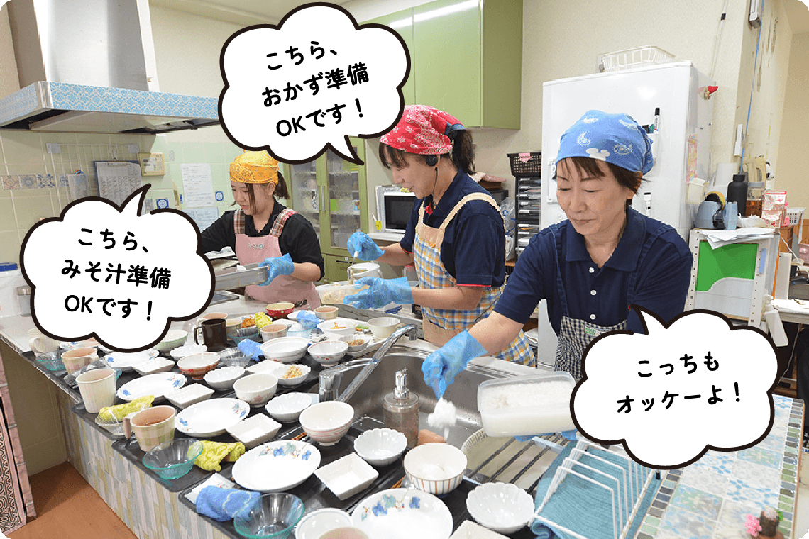 万亀会には「特別養護老人ホーム万亀園」「地域密着型特別養護老人ホーム千鶴園」と2つの入所サービスがあり、そこで介護職員が勤務しています。ご利用者さまの起床や就寝のケアをはじめ、 入浴・排泄・食事の介助を行い、日々の暮らしを支えています。さらに、 洗濯や掃除、食事の盛りつけなど身近な生活のサポートも大切な役割です。