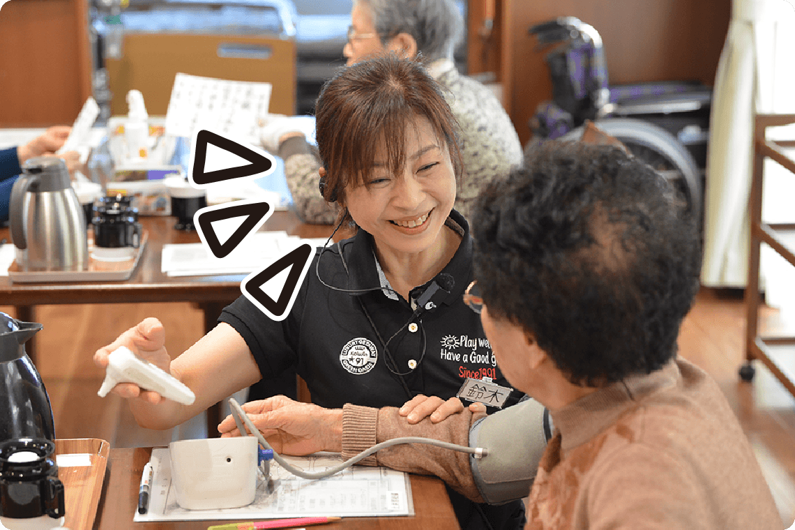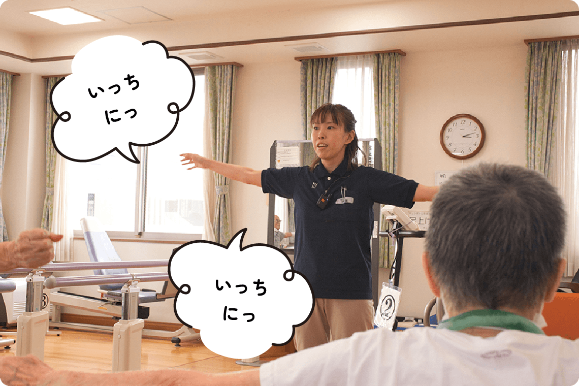 万亀会では、「デイサービス万亀園」と「リハビリデイサービスちづる」の2つのデイサービスを運営しています。介護職員は、利用者様の毎日に寄り添いながら、健康づくりのための体操や運動をサポートするお仕事です。「今日はこんなことができたね」「また来週も楽しみだね」といった声が行き交う、明るくあたたかな雰囲気の職場です。